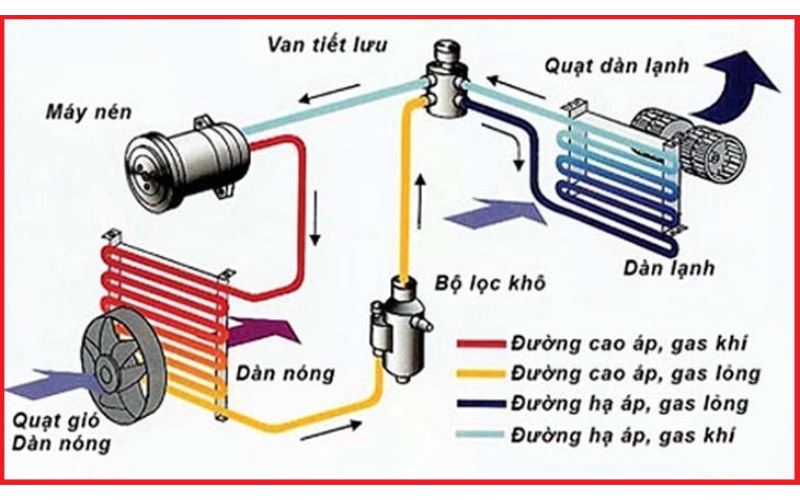 - Truyền nhiệt: Gas lạnh hoạt động như một phương tiện truyền nhiệt, giúp vận chuyển nhiệt từ bên trong ra bên ngoài. Khi gas bị nén và giãn nở, nó hấp thụ nhiệt từ không gian nội thất, sau đó thải nhiệt ra môi trường thông qua dàn nóng bên ngoài.
